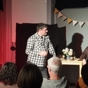Un petit éclairage sur nos techniciens s’impose. Patrick Rouxet Serge Vandorselaere nous mettent en son et lumière sur chacun de nos spectacles. Ils nous confectionnent également des décors sur-mesure. Bref, ce sont des hommes de l’ombre, mais sans eux… pas de spectacle !