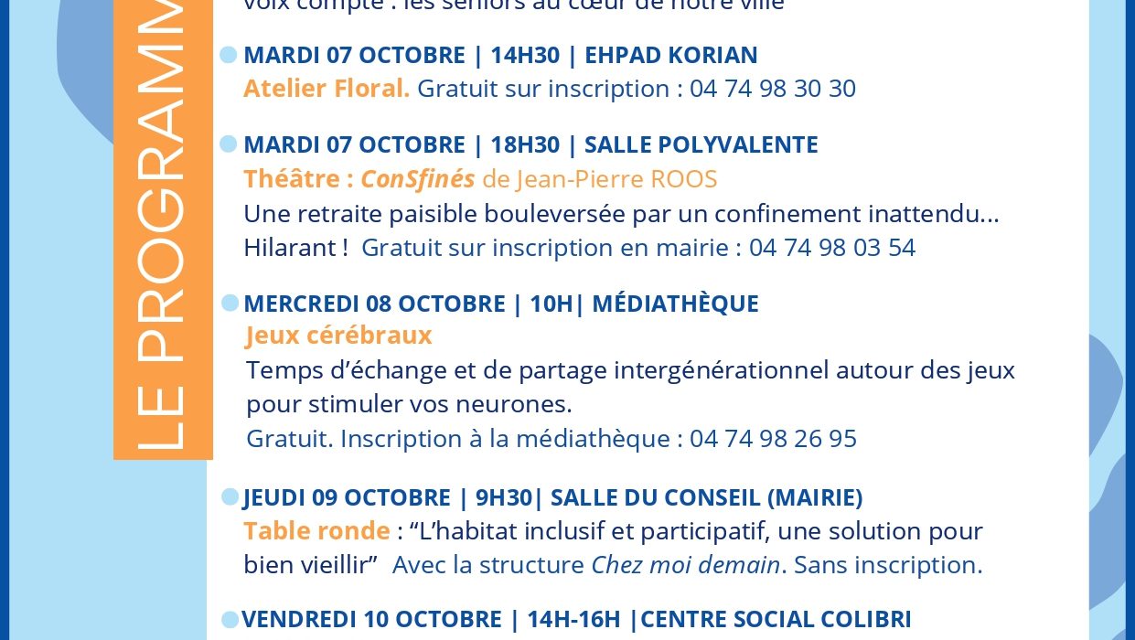 - Vendredi 10 octobre de 14h à 16h : un « Café Deuil » – Un atelier avec Sandrine CLOT, pour comprendre et évoquer la perte d’une personne, d’un lieu, d’un travail… tout le monde peut être concerné et ça fait souvent du bien d’en parler.